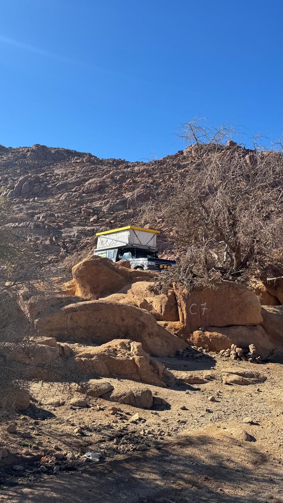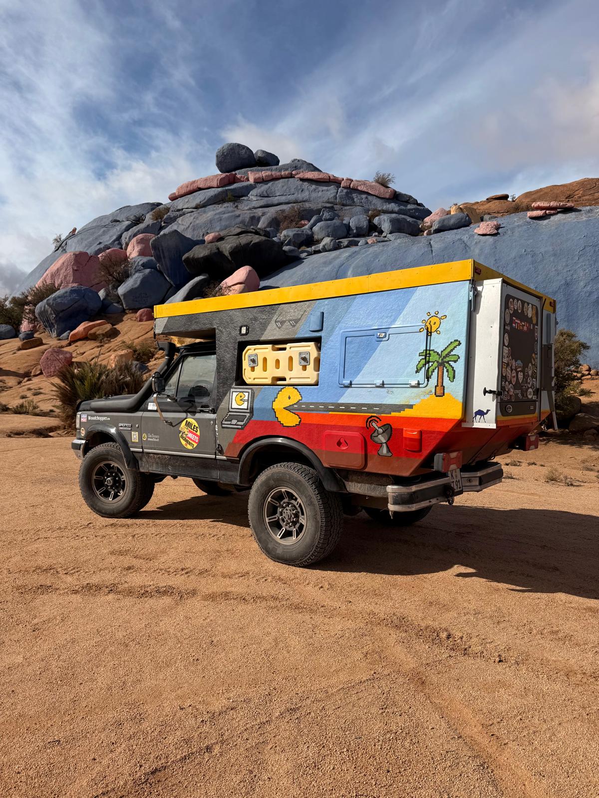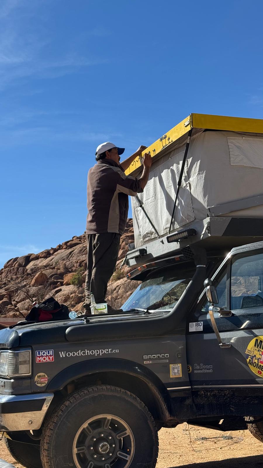 Außerdem sammelten wir ein weiteres Andenken ein: wir ließen uns eine Silhouette einer Dromedar-Karavane auf das Bronco-Dach malen.