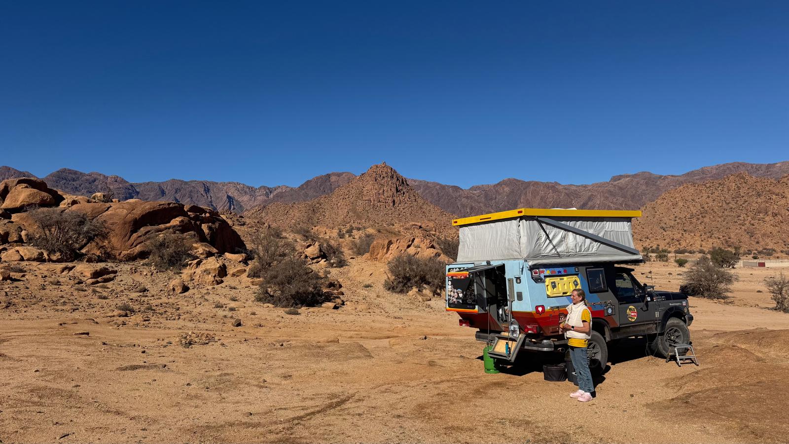 Nach drei Tagen zogen wir auf einen kleinen Campground, ziemlich direkt nebenan, um (Auberge Camping Tafraout). Dort konnten wir endlich mal wieder warm duschen, sofern der Beuler funktionierte. Und von dort aus hatten wir einen fantastischen Blick über das Tal, eingerahmt von diesen markanten Felsen. Es war einer der schönsten Plätze, wenn nicht sogar der schönste, auf unserer bisherigen Reise, inklusive freundlichem Team.