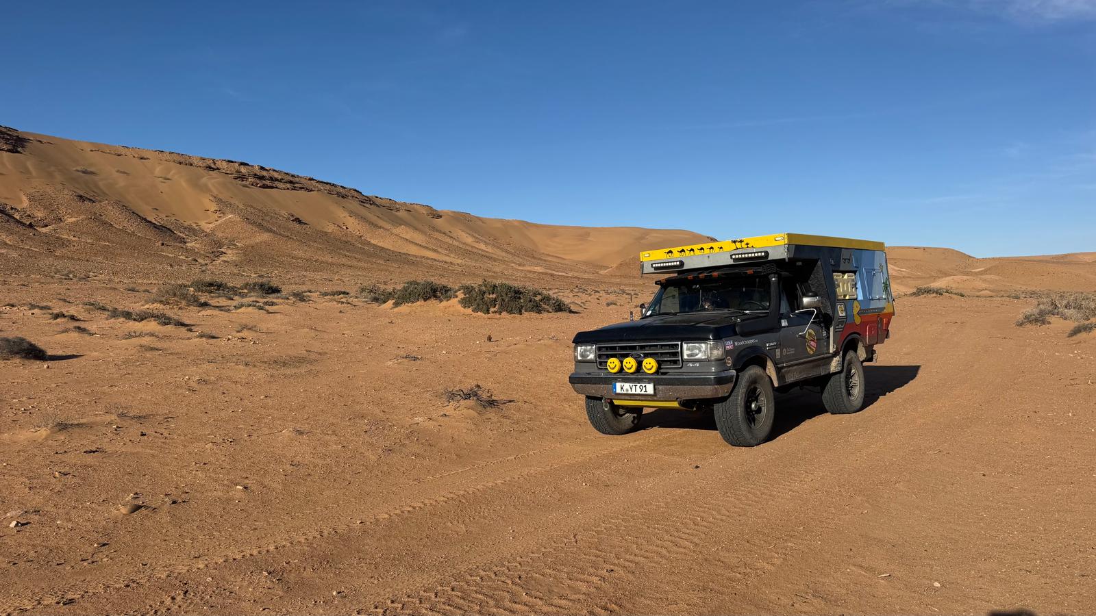 Als es endlich weiterging, waren wir im Flow. Eigentlich wollten wir unterwegs stoppen, doch wir rollten einfach weiter. Bis El Aaiún. 🎥 Westsahara.